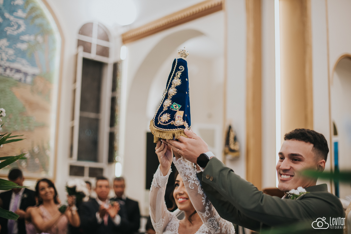 A cerimônia aconteceu na encantadora Igreja São Benedito de Aparecida/SP, um local perfeito para um ato tão solene e sagrado. Em um dos momentos mais emocionantes, os noivos coroaram Nossa Senhora Aparecida, consagrando seu casamento e sua jornada a ela, em um gesto de fé profunda que tocou a todos os presentes.