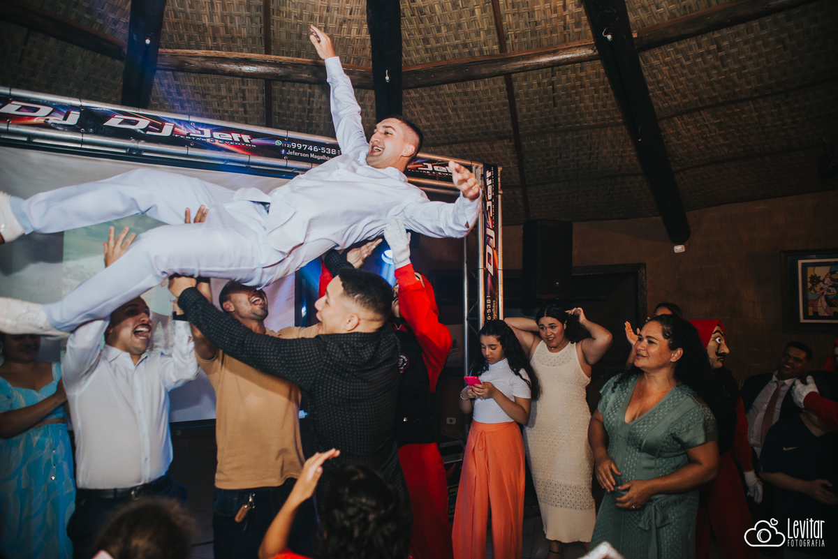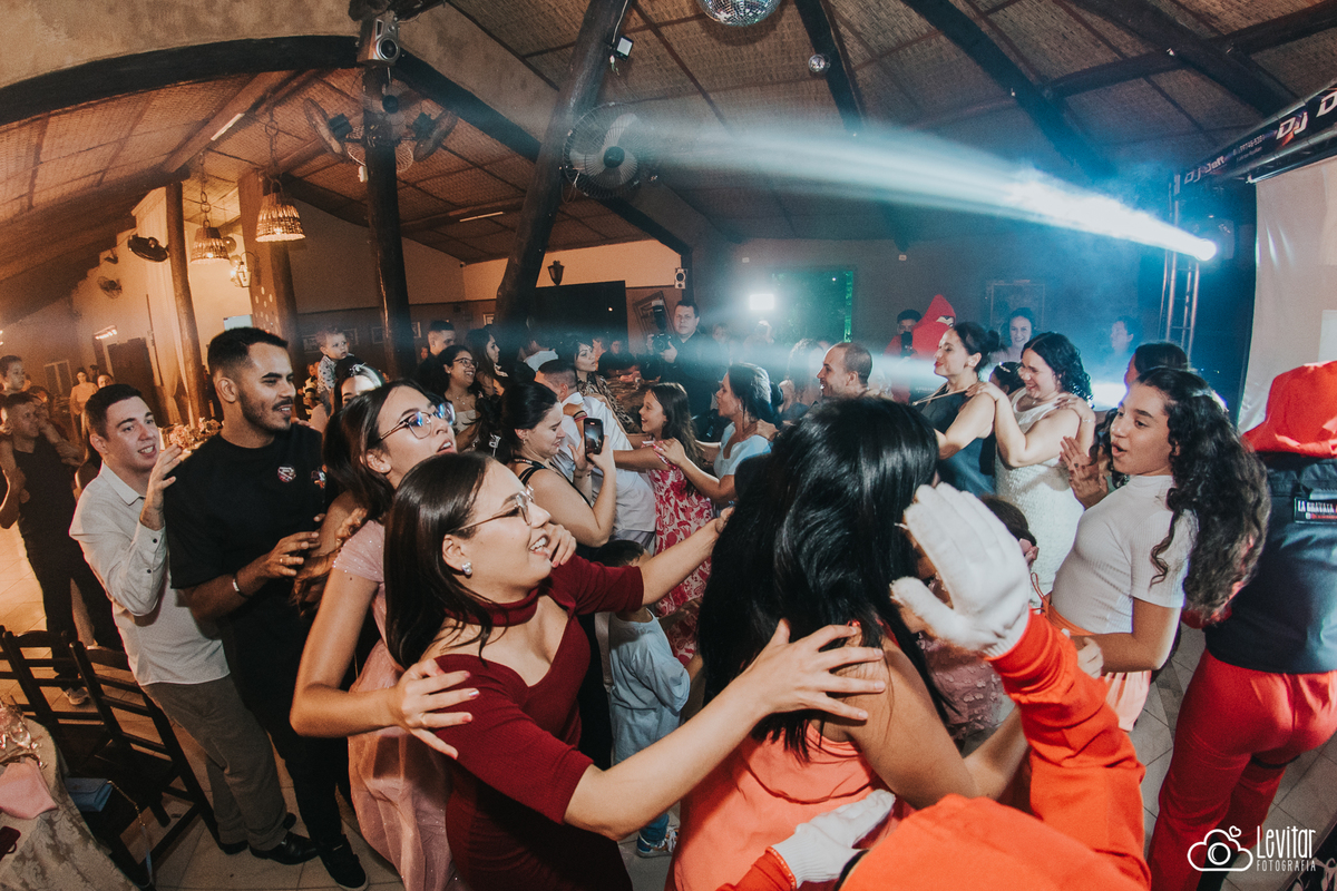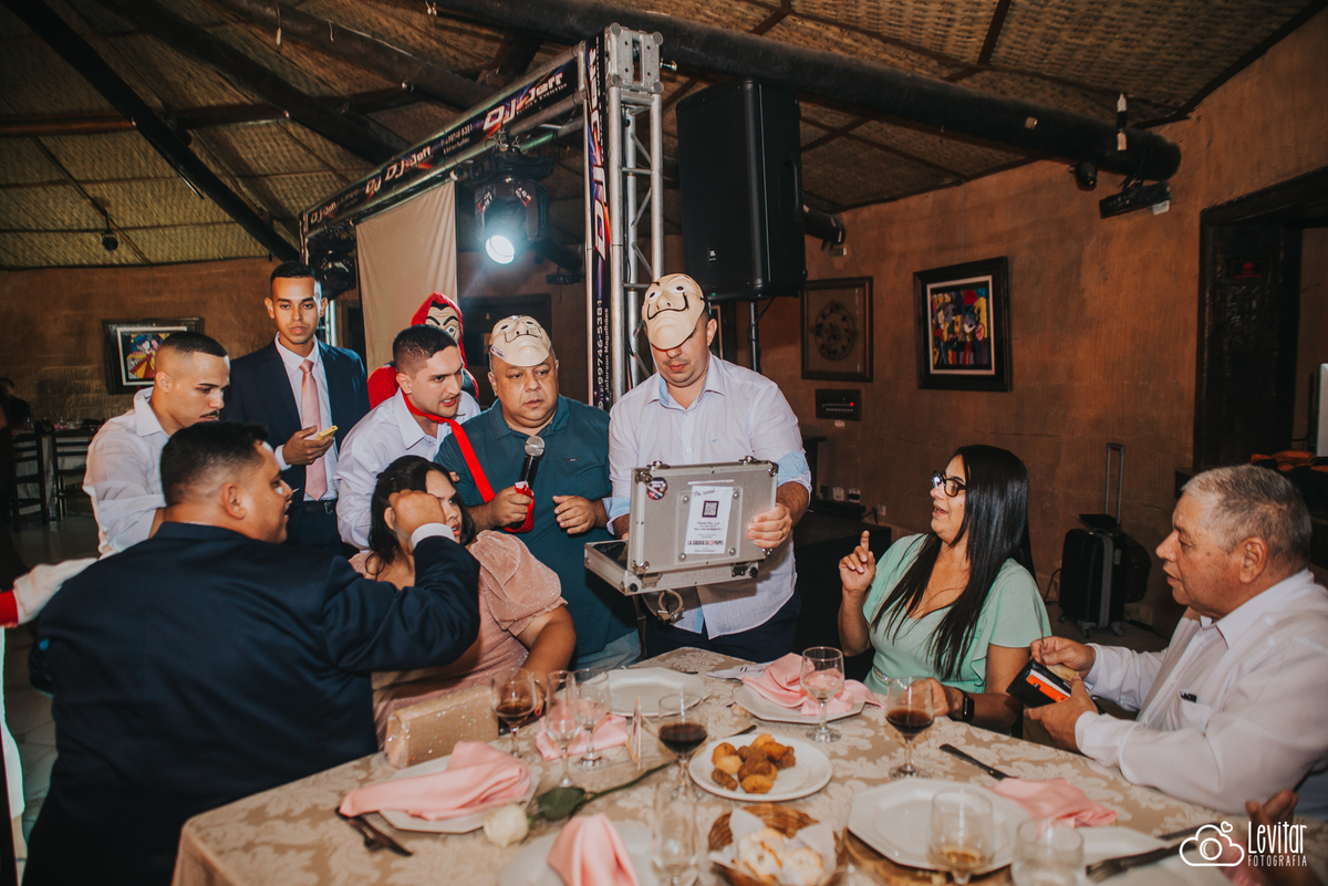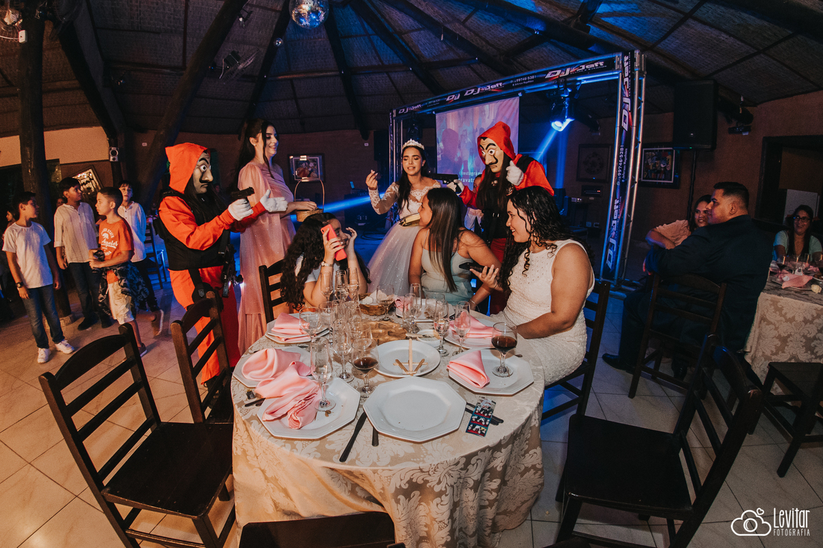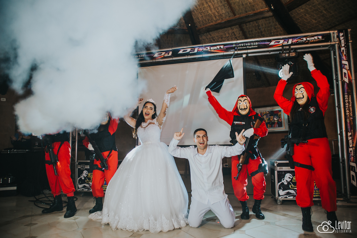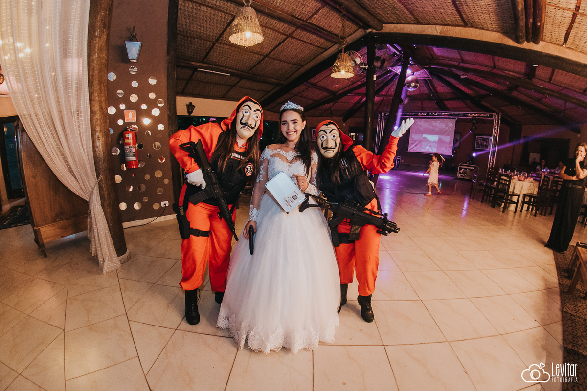 E a festa? Ah, a festa foi uma experiência à parte! Além da animação contagiante, um momento arrancou gargalhadas e virou destaque da noite: a brincadeira da gravata ganhou uma versão inusitada e cinematográfica. O casal contratou uma equipe caracterizada como os personagens de La Casa de Papel, trazendo um toque irreverente e teatral que transformou o momento em um verdadeiro show.