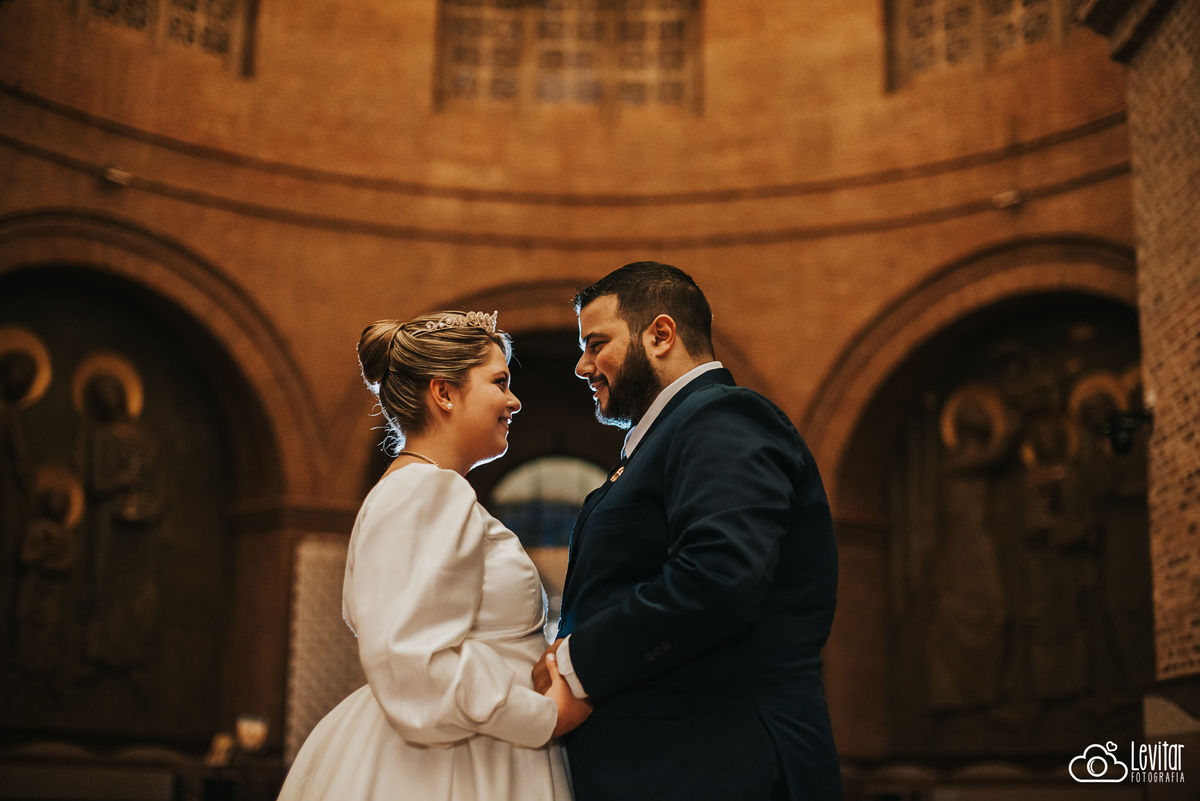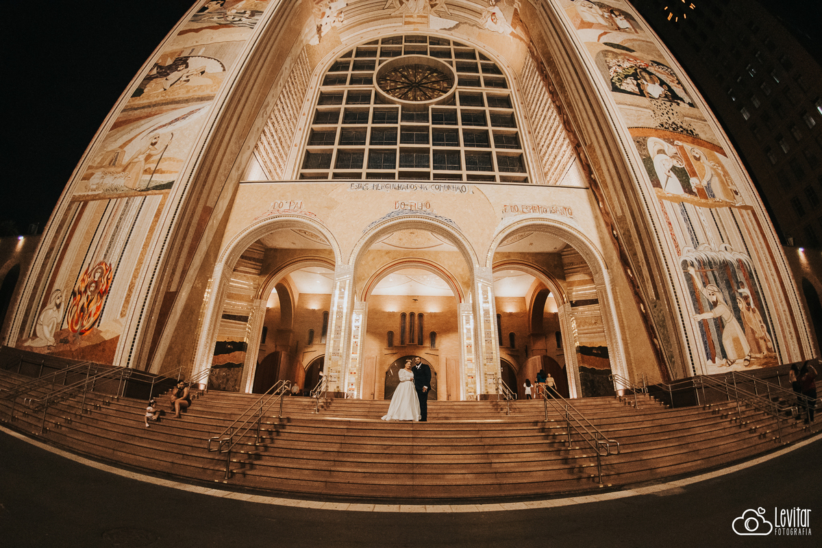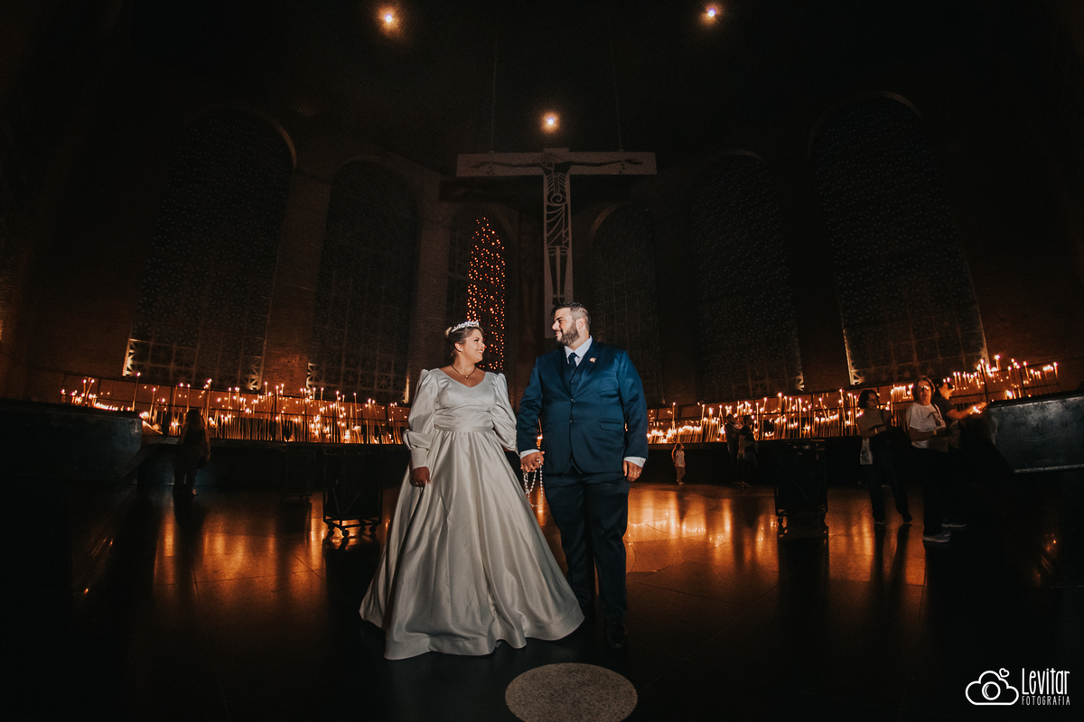 Cada ponto do Santuário oferece cenários únicos para as fotos. O ensaio deles foi realizado após a cerimônia, e o casal posou em locais que ressaltam a espiritualidade e a história desse lugar. A Sala das Velas, com sua atmosfera de devoção, e os corredores centrais, com suas imponentes colunas e detalhes arquitetônicos, foram alguns dos pontos explorados, resultando em imagens marcantes e cheias de sentimento.