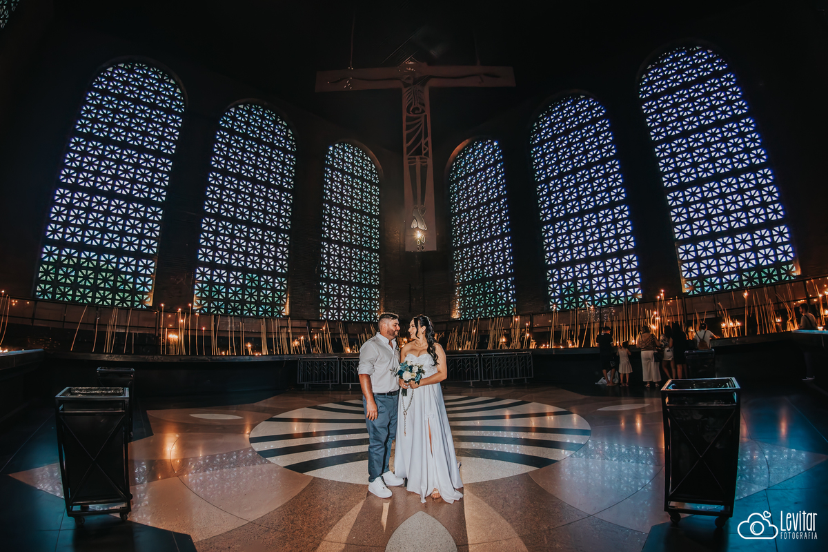 Logo após o “sim”, fomos juntos registrar esse momento com um ensaio especial pelos espaços autorizados do Santuário. Começamos pela Capela das Velas, onde o clima de oração envolve e acalma. Seguimos para o Campanário, iluminado por uma linda luz roxa que deu um toque mágico às fotos. Também passamos pela Porta Santa e encerramos no Nicho de Nossa Senhora Aparecida — um lugar que sempre traz uma paz indescritível.